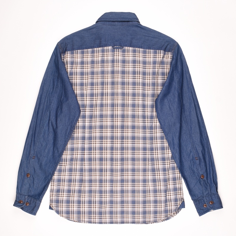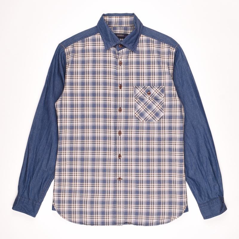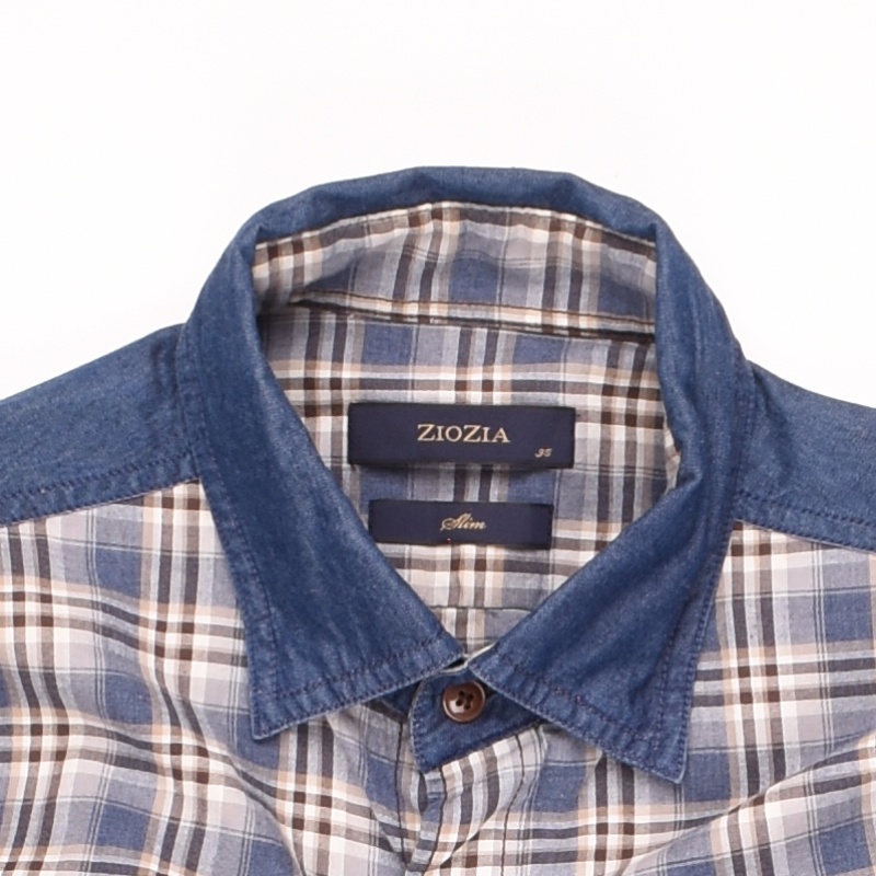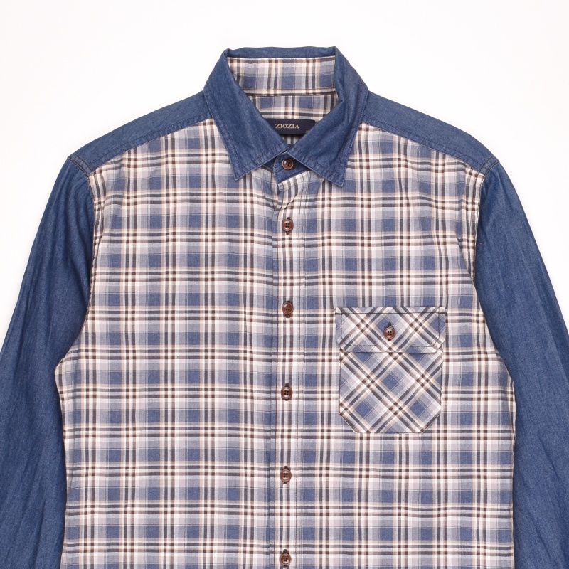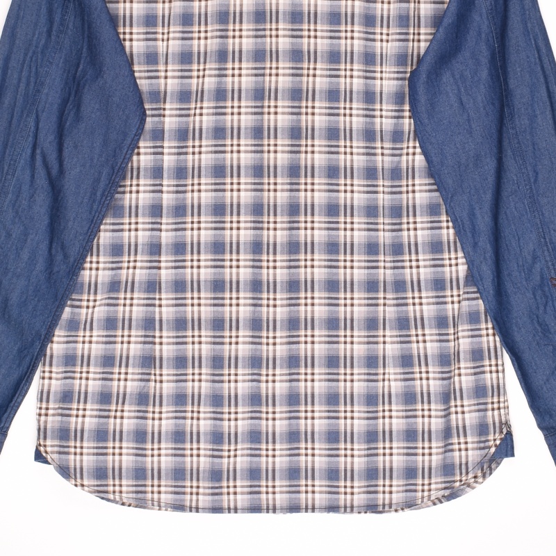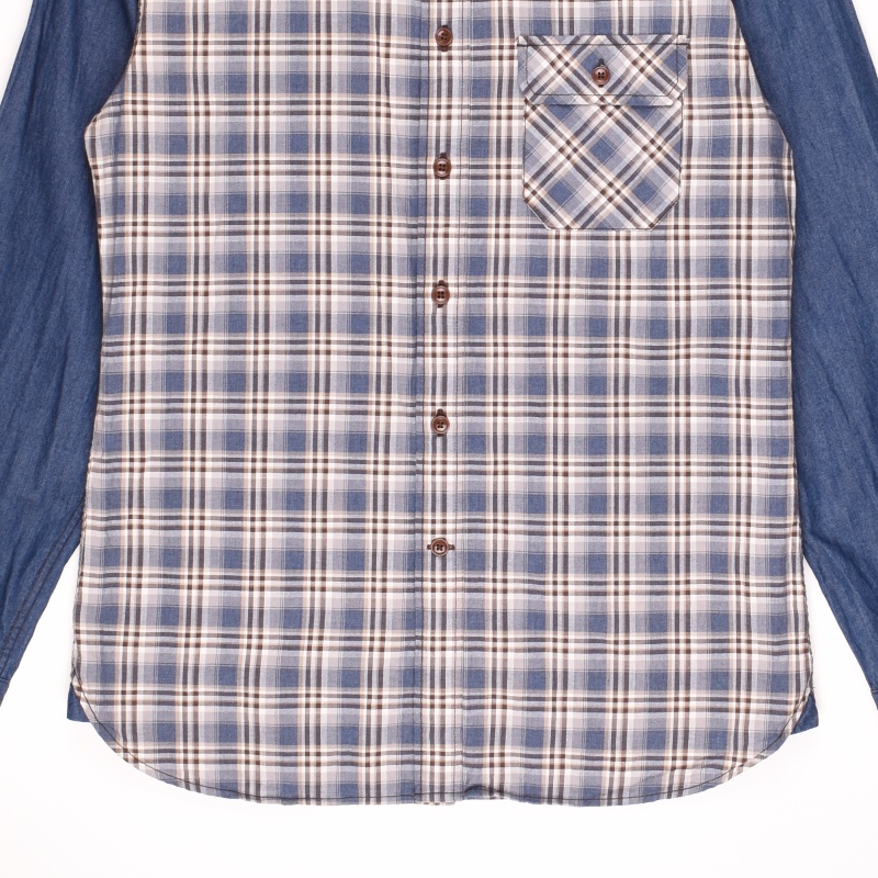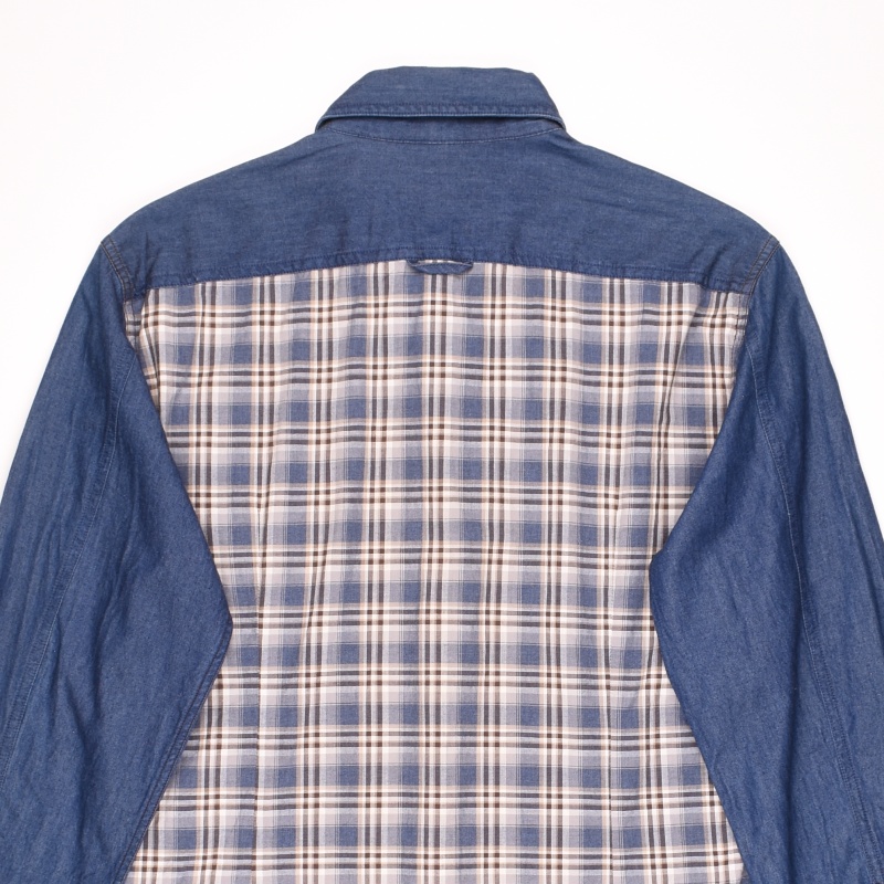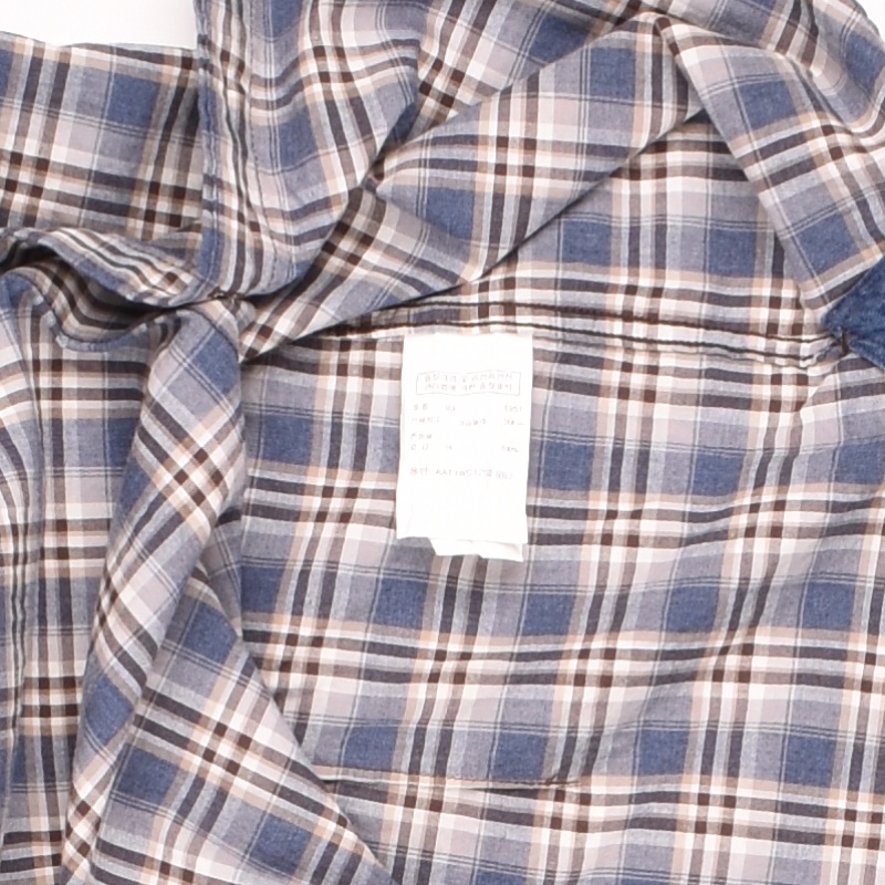 4091.지오지아 체크패턴 솔리드 청남방셔츠/정품/남성 95색상: 네이비소재: 면100%라벨사이즈: 95실측(cm) - 어깨: 44cm, 가슴반품: 50cm, 총기장: 72cm, 소매길이: 61cm